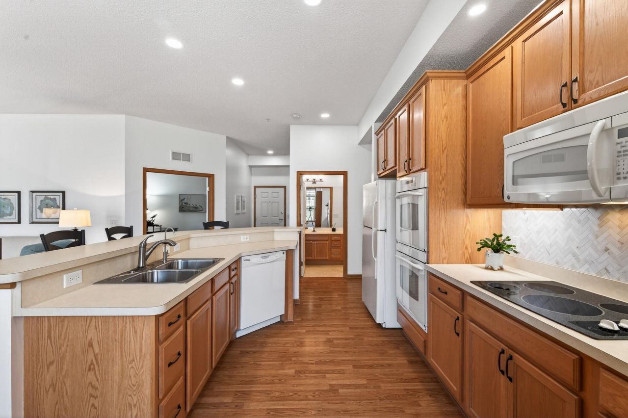 Welcome to 17393 72nd Ave N #102 in Maple Grove! This beautifully maintained 1-bedroom, 1-bath condo with a dedicated office/flex room offers comfortable, low-maintenance living in a prime location close to shopping, dining, parks, scenic walking trails, and easy freeway access. Inside, you'll find a bright, open-concept living and dining area filled with natural light, highlighted by an inviting living room with a cozy gas fireplace?perfect for relaxing or entertaining. The kitchen offers ample cabinetry and counter space and has been enhanced with updated lighting, a stylish tile backsplash, cabinet hardware, under-cabinet lighting, pull-out cabinet organizers, and a newer kitchen faucet, providing both functionality and flow for everyday living. Step out from the living room onto your private covered balcony overlooking the beautifully maintained courtyard, where mature trees fill in nicely during the warmer months to create a peaceful, green view?an ideal place to enjoy morning coffee or unwind in the evening while taking in beautiful sunset views. The spacious primary bedroom includes a large walk-in closet, while the bathroom is conveniently located nearby with updated lighting. A separate office/flex room offers excellent versatility for working from home, hobbies, or additional guest space. You'll also appreciate the full laundry room with a brand-new washer and dryer (2026)?no cramped laundry closet here?plus additional storage throughout the unit. Numerous thoughtful updates have been completed in recent years including fresh interior paint, new carpet, updated lighting fixtures, window coverings, kitchen upgrades, and more. Enjoy the convenience of secure building access, heated underground parking, a private storage space, and well-maintained common areas, all while being just minutes from parks and miles of nearby walking and biking trails. Easy living in the heart of Maple Grove?move right in and enjoy!
