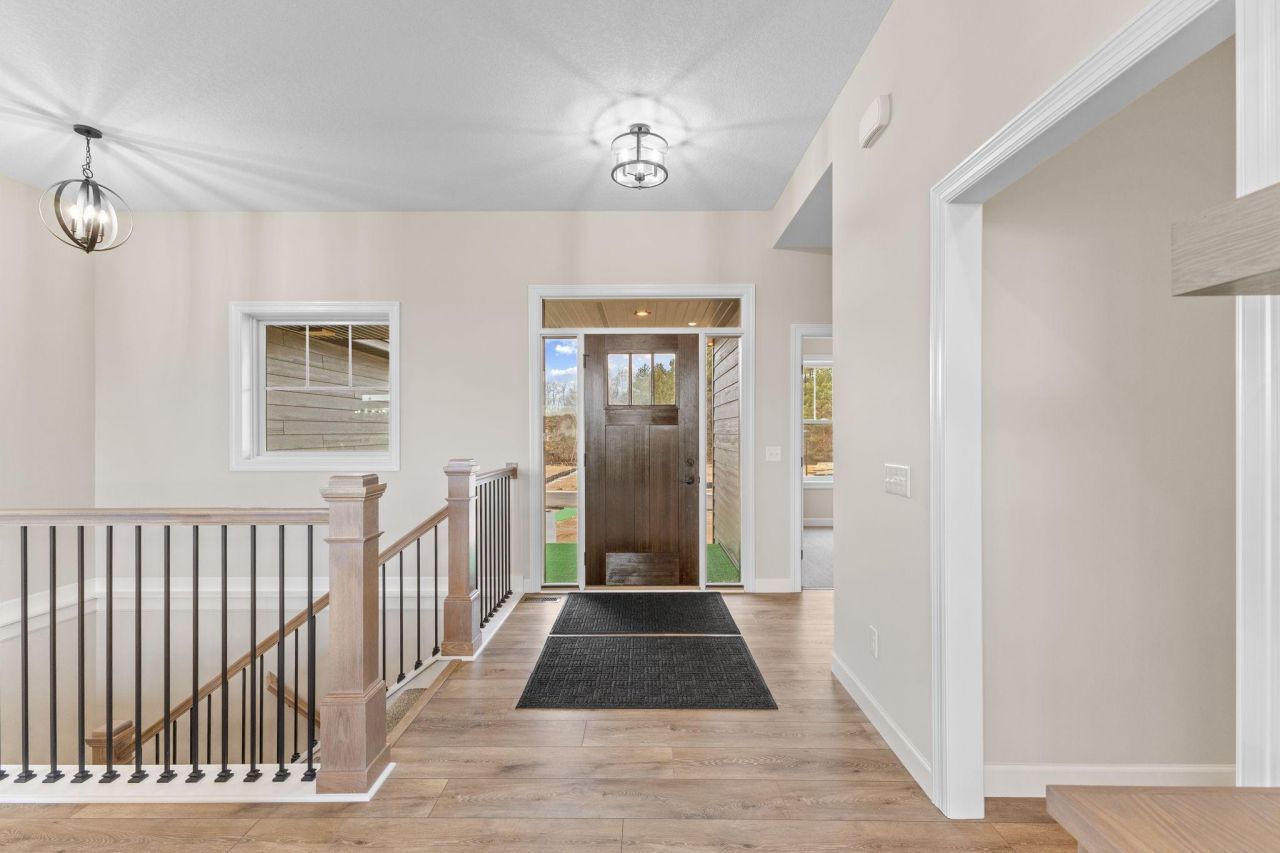 Situated on over an acre in Ham Lake, this stunning walkout rambler offers 4 bedrooms, 3 bathrooms, and exceptional craftsmanship throughout, built by TH Construction. The exterior commands attention with LP siding on the front with custom black accents and striking black Anderson windows. Take a step inside to be welcomed by an open concept living room with double box vaulted ceilings, lineal gas fireplace featuring tile to the ceiling with built-in cabinets on both sides. Massive windows flood the main level with natural light, leading you to a chef's kitchen equipped with a white oak island, quartz countertops, a walk-in butler pantry, and custom cabinetry stretching to the ceiling. The main floor is designed for convenience and luxury, featuring a dining room with an oversized patio door, a home office/den, 2nd bedroom, full tile bath, an efficient laundry room, and a mudroom connecting to the expansive 46x28 4-stall garage. The primary suite is a true retreat, boasting box-vaulted ceilings, walk-in closet and a spa-like private bath with white oak cabinetry, a walk-in tile shower, and a free standing tub. Take a walk downstairs to find an entertainer`s dream, featuring a large open concept family room, including an additional gas fireplace with stone surround, a 14-foot wet bar, with two-tier island, and a thoughtfully designed bar top overlooking a dedicated golf simulator room?. Featuring custom built padding surround to perfectly fit the room. Two additional large bedrooms and a full tile bathroom round out the lower level. Designed by a fully custom builder/architect with over 35 years of experience, this home makes your dream a reality. This Rambler has it all, check it out today!!
