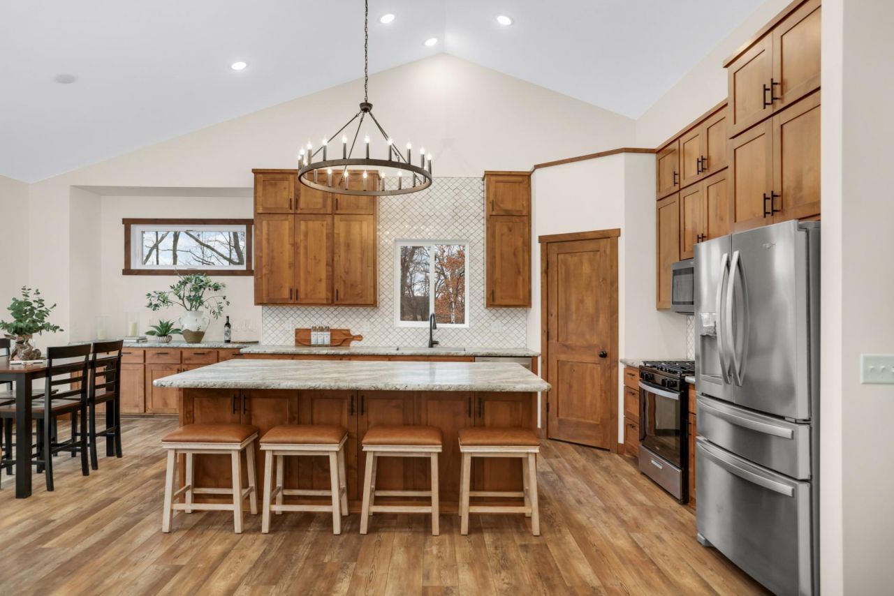 A rare opportunity to own a custom-built one-story home on 30 private wooded acres, offering the perfect blend of modern living and peaceful country privacy. Featuring 4 bedrooms and 4 bathrooms, the open floor plan is filled with natural light and beautiful wooded views from nearly every room. The chef's kitchen includes a large center island perfect for entertaining and everyday living. The spacious primary suite offers a walk-in shower and convenient walk-through closet. Enjoy main-floor laundry, a functional mudroom, and easy access to the extra-deep 4-stall garage. The maintenance-free exterior makes ownership simple while the expansive acreage provides room for trails, wildlife watching, gardens, recreation, or future outbuildings. A rare opportunity to enjoy new construction with private acreage living. The walk-out level is perfect for visiting guests, featuring a large bright entertaining space including a wet bar, private full bathroom and separate guest laundry.
