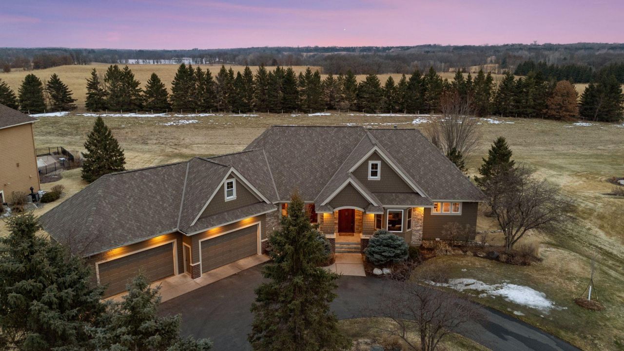 Expertly crafted by Kootenia Homes, this unprecedented residence is set within the prestigious Farms of Lake Elmo, a highly sought-after neighborhood known for its magnificent estate properties and serene, private setting. From the moment you arrive, the home's architectural elegance is unmistakable. An arched wood front door welcomes you into a grand foyer, where a globe chandelier glows beneath one of several dramatic dome ceiling treatments found throughout. Rich hand-scraped walnut flooring flows seamlessly into the two-story great room and dining area, where a striking coffered ceiling with massive beams creates a bold architectural statement, and its wall of oversized windows frames tranquil, south-facing views of Lake Elmo Park Reserve while filling the space with natural light. Just beyond, the gourmet kitchen is designed to inspire, offering abundant cherry cabinetry and granite countertops, functional center islands, professional appliances including a warming drawer, walk-in pantry, and handy grill deck. Elegant pendant lighting highlights the workspace, while a beautifully painted dome ceiling crowns the breakfast nook, and the adjoining hearth room offers a warm and inviting retreat as you relax beside the gas fireplace. Designed for convenient main-level living, the luxurious Owner's suite with private deck access offers breathtaking park views and a coved ceiling that enhances the room's openness, plus its spa-inspired en suite delivers all the expected luxuries, including a walk-in closet with fantastic organization. Also appreciate a stately office with custom built-ins and the conveniently located laundry room, powder room, and fully equipped mudroom just off the four-car attached garage that's outfitted with cabinets, a sink, and 30+ feet of built-in storage shelving. The walkout lower level is equally impressive and perfectly suited for entertaining, featuring a lavish, walk-behind wet bar with bonus appliances, including an ice maker and microwave, next to a generous billiards area and enviable home theater enveloped by acoustic sound paneling with LED lighting. Three additional bedrooms with walk-in closets and two baths provide comfortable accommodations for other household members and guests; and a craft room, exercise room, and cozy screened porch overlooking the expansive backyard further enhance the home's exceptional livability. Thoughtfully designed and impeccably executed, this remarkable residence offers timeless luxury and ultimate privacy in one of Lake Elmo's most distinguished communities.