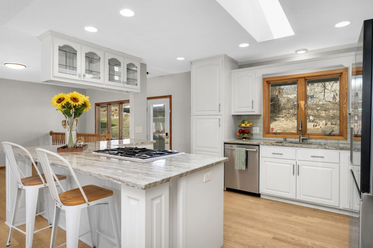 The moment you walk into this gorgeous sun-filled rambler, you'll know this is the one. Blending classic mid-century charm with fresh modern updates, this Bloomington home offers a bright open layout, beautiful oak hardwood floors, fresh neutral décor, and thoughtfully updated spaces throughout. The stunning kitchen features white enameled cabinetry, sleek hardware, granite countertops, stainless steel appliances, and a stylish grey subway tile backsplash. A large center island with breakfast bar opens seamlessly to the dining and living areas, creating the perfect space for everyday living and entertaining. Skylights and recessed lighting add even more natural brightness to the home. The main level includes four spacious bedrooms, including a private primary suite with its own full bath. The finished lower level expands the living space with luxury vinyl plank flooring, a cozy gas fireplace, and a wet bar?ideal for movie nights, entertaining, or relaxing. The flexible lower level also offers space for a hobby space, workout room, or Storage. Situated on a mature lot in a quiet Bloomington neighborhood, this home offers space, style, and versatility in a fantastic location.