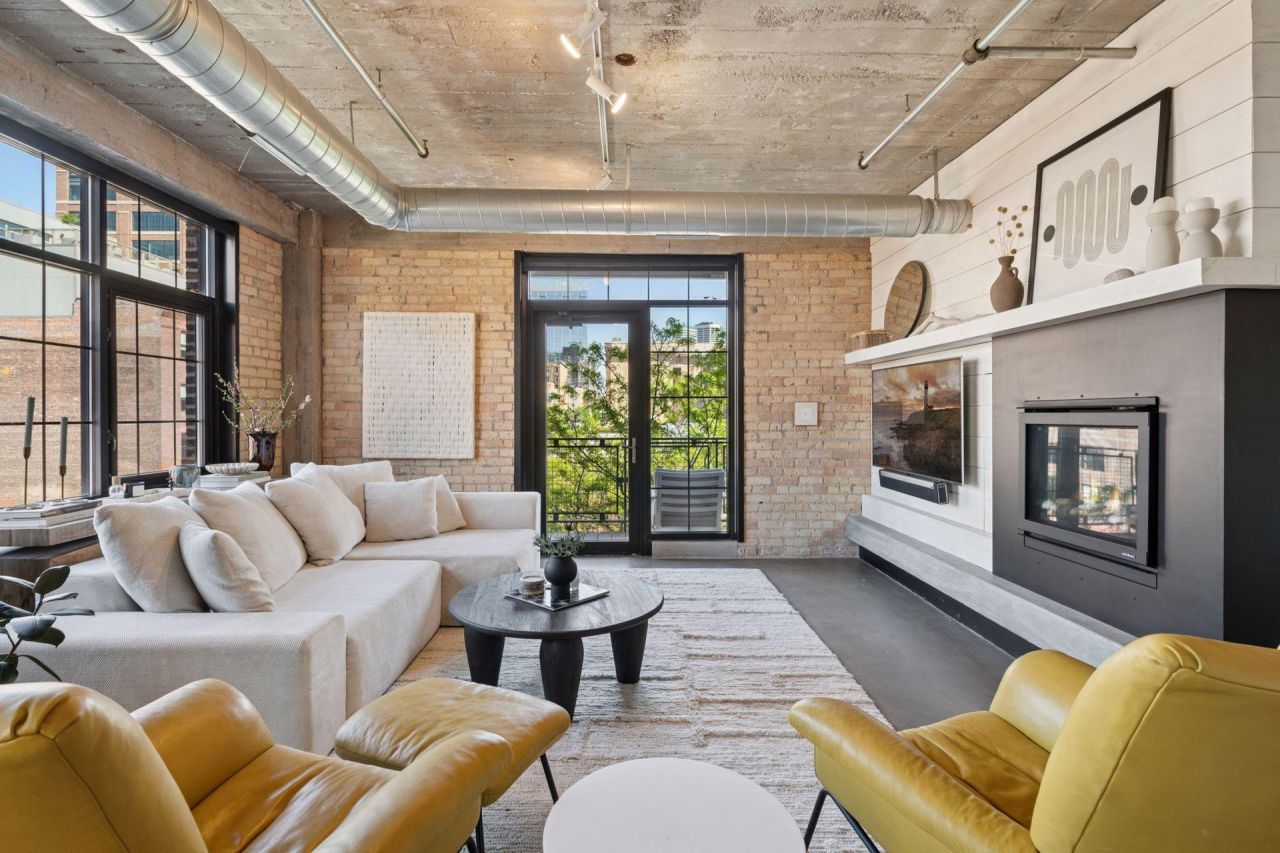 Welcome to the boutique Bookmen Lofts, a premier building in the North Loop. This sunlit southeast corner loft beautifully blends classic charm with modern amenities. Featuring exposed brick, expansive windows, a gas fireplace, and a balcony offering breathtaking views of the skyline and Target Field. Attention to detail is evident from the moment you enter this exceptional 2-bedroom, 2-bathroom unit, complete with an additional office/den space. Enjoy the convenience of two parking stalls and additional storage. The building offers a fitness room and a community patio with grills and stunning views. Step outside and explore the vibrant neighborhood, with easy access to light rail, bars, restaurants, coffee shops, breweries, and scenic trails along the riverfront.