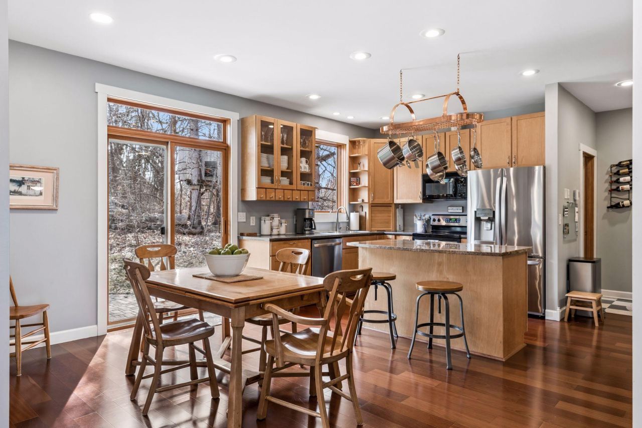 Nestled on a former apple orchard on a quiet cul-de-sac, this charming custom-built two-story sits on .43 acres with a beautifully wooded backyard offering privacy and natural beauty. From the moment you enter, the dramatic vaulted ceiling creates an impressive first impression, complemented by warm faux wood flooring, 3-panel maple doors, and crisp enamel trim throughout. The inviting family room features a striking three-sided fireplace with custom shelving, creating warmth and character. On the opposite side, a cozy sunroom filled with lovely windows invites in beautiful natural light and offers the perfect place to relax year-round. The spacious kitchen is designed for both everyday living and entertaining, featuring a large granite center island, warm maple cabinetry, stainless steel appliances, informal dining space, and a walk-in pantry. Upstairs, architectural vaulted ceilings add character to the bedrooms, and a loft with a built-in desk provides an ideal home office or homework space. The primary suite offers a walk-in closet and a spa-like bathroom with an oversized walk-in shower featuring glass block detail and heated floors for added comfort. The additional bedrooms are generously sized and thoughtfully designed. The lower level is ideal for entertaining, offering 8'8' tall ceiling and a large open gathering space anchored by a two-sided fireplace. A fourth bedroom with its own fireplace and a ¾ bathroom provide flexibility for guests. A partially finished room offers the perfect opportunity for a craft space, game room, or additional flex area, along with ample storage. Additional highlights include a 26-foot-deep oversized insulated garage complete with an EV charger, Marvin windows, durable Hardie board siding, multi-zone heating and cooling, washer/dryer 2025, and a beautiful paver patio for outdoor enjoyment. An exceptional value in a convenient location close to shops, dining, and everyday amenities. This one is not to be missed!